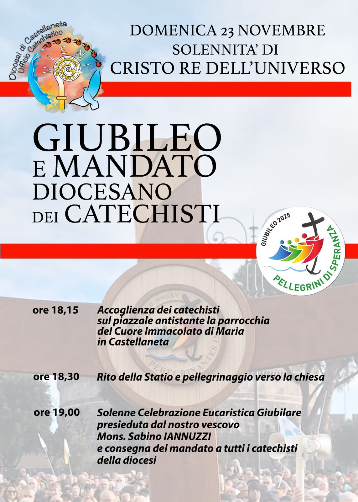 Il prossimo 23 novembre vivremo il giubileo dei catechisti. L’evento che si svolgerà in occasione della solennità di Cristo Re dell’universo, sarà anche un’occasione durante la quale il nostro vescovo, mons. Sabino Iannuzzi conferirà il mandato a tutti i catechisti della diocesi. La solennità di Cristo Re non è solo la fine dell’anno pastorale, ma anche un riferimento specifico che racconta la necessità per ogni cristiano di dare inizio e compimento a ogni frangente della propria vita, così come ad ogni impegno pastorale, ricapitolando tutto in Cristo Gesù nostro Signore. Vivremo questo appuntamento con la consapevolezza della missione a cui siamo stati chiamati, innanzi tutto come Diocesi da Dio attraverso il nostro pastore, e poi come singole comunità da dove nascono operai per l’unica vigna del Signore.